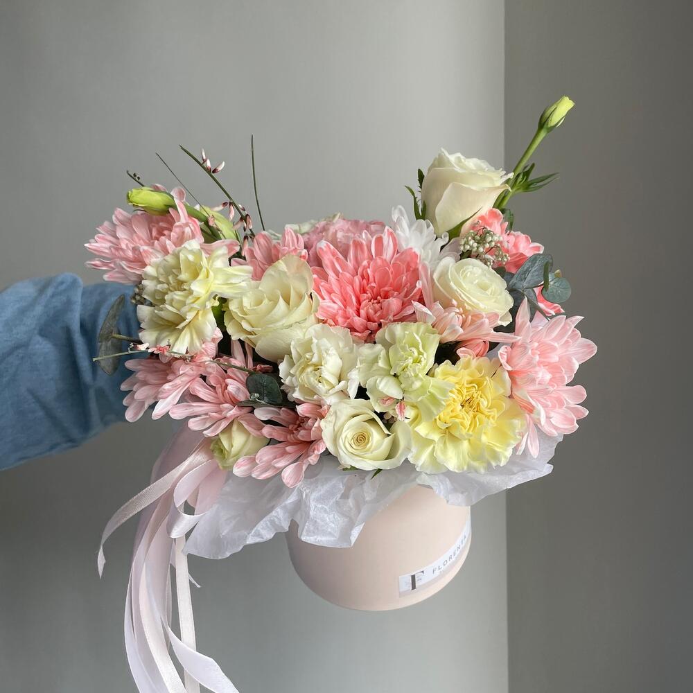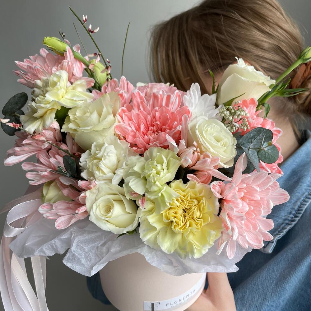 Озотамнус - 1 шт. Хризантема кустовая - 1 шт. Эвкалипт - 2 шт. Гвоздика - 2 шт. Эустома - 2 шт. Роза Кенийская - 3 шт. Коробка шляпная - 1 шт. Гвоздика кустовая - 1 шт.